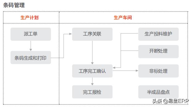 通过与易呈ERP生产管理系统的信息交互,结合条码在车间、产线上的数据采集,实现: