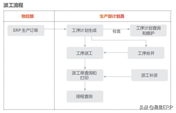 从 易呈ERP系统接收生产订 单,自动分解到每道工序, 生成每道工序计划。计划员 根据工序计划进行派工,按 班次打印出派工单。生产订 单的分解、工序计划的排程 由 易呈ERP软件自动处理,大大 提高了计算效率和准确度。