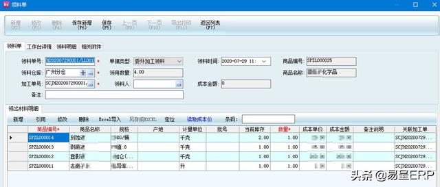 领料单:领料单引用加工单号,领用数量可根据实际加工数目手动修改。