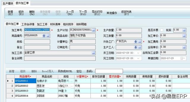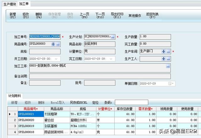 加工单:加工单按照工序下达,在bom中已设定工序用料的,加工单中会自动带出材料明细。