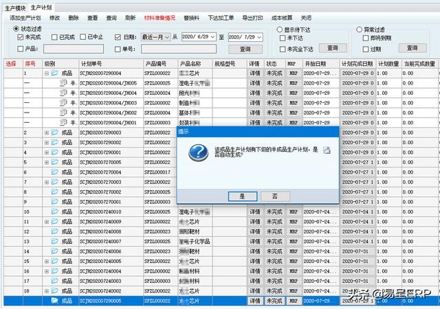 生产计划:销售订单保存可自动提示生成生产计划,建立成品生产计划后,自动提示有半成品计划可生成。