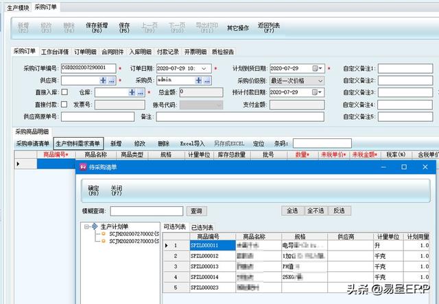 采购订单:采购订单,选中供应商后,点击生产物料需求清单,显示所有生产计划已运算完材料情况的物料清单。