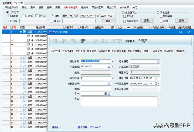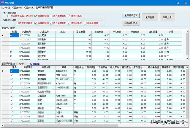 生产管理主要通过BOM表快速生成半成品、零件等生产计划,用树状的形式来体现;通过MRP运算,计算所需采购的清单,及时下单,保证物料及时到。