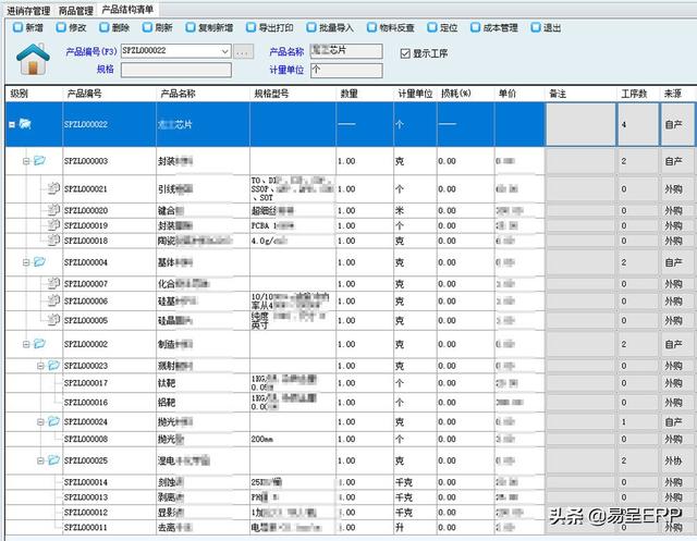 产品结构管理:反映一个产品与部件直接的构成关系,能通过各种物料清单(BOM)表现,复杂的产品结构将清晰可见,针对不同对象分类统计查询,能有效地管理产品的全局信息。软件针对照明行业的工序及大量零部件的管理,BOM表与生产计划支持多层级树形显示,其上下层级关系均可一目了然。