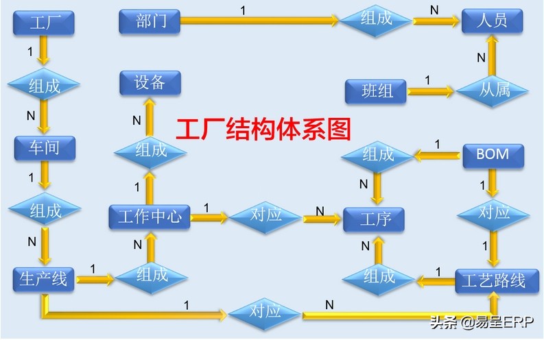 下图展示了生产环节中的各个实体间的关系,一个工厂由多个生产车间组成,车间又包含多条生产线,生产线上又有多个工作中心(工作中心由相同功能的设备分组),在各个工作中心上完成各工艺路线的工序;班组是对人员的分组,班组和部门独立开,人员挂部门下,班组作为人员的属性,考勤班组和计件班组区分考虑,二者虽有可能重复,但可避免一个概念在两个用途间的干扰。而生产管理系统建设能够实现对工厂生产的人员、生产线、流程更有效的组织、管理与控制。
